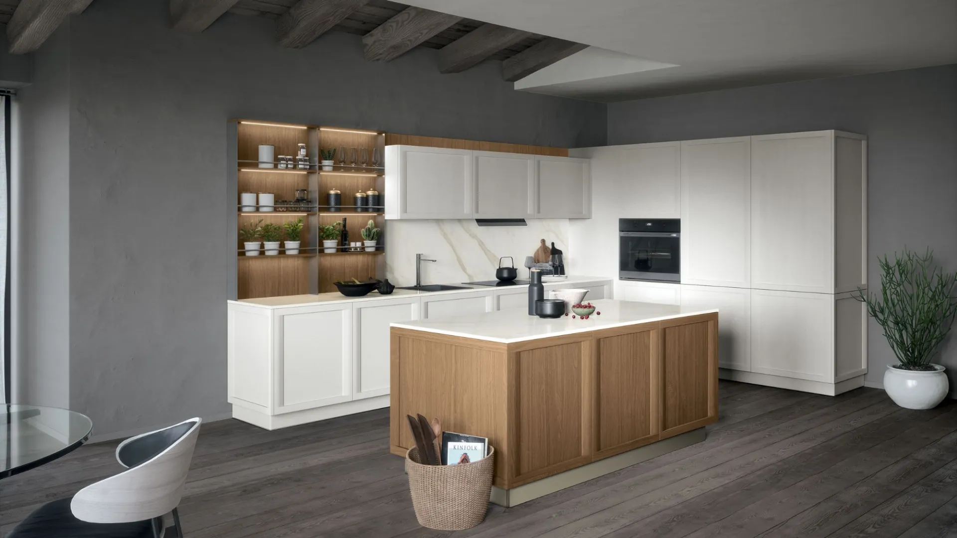 Le finiture scure e materiche creano un ambiente sofisticato, mentre i moduli funzionali offrono massima praticità nella vita quotidiana.